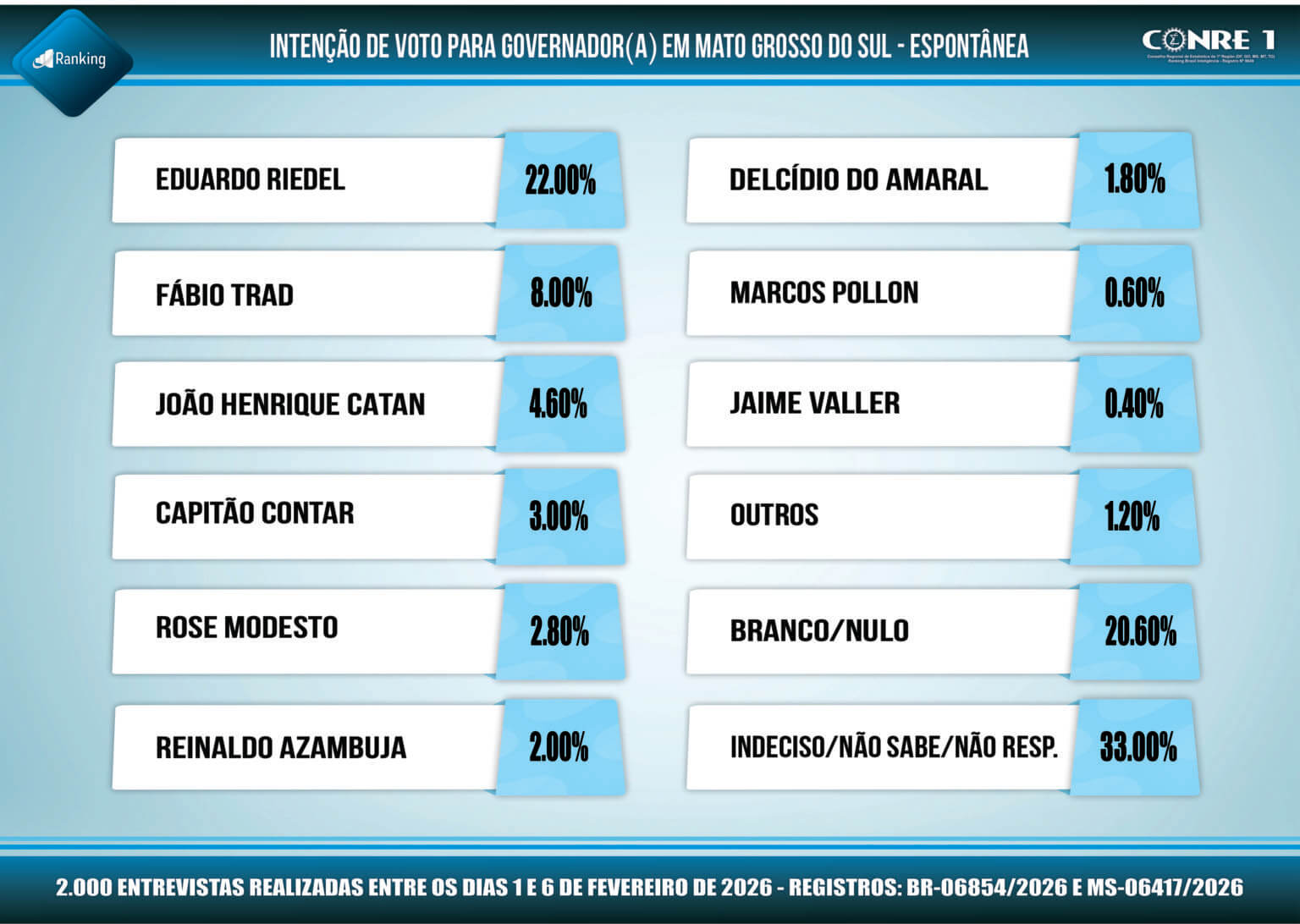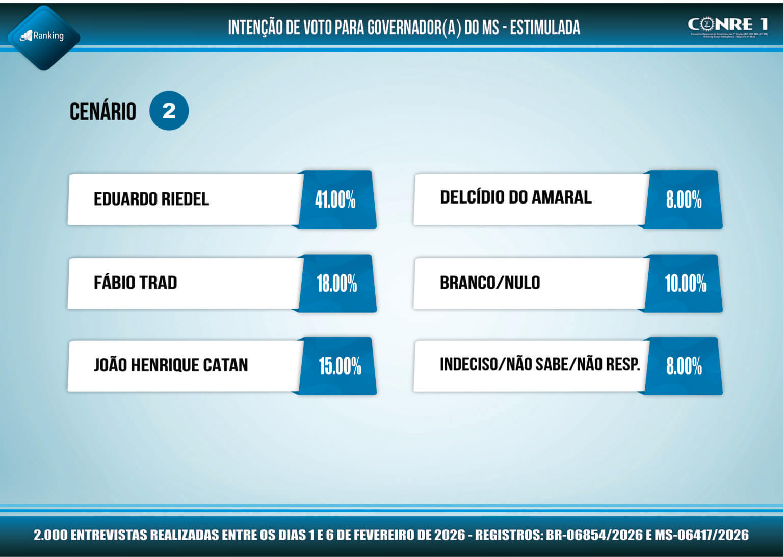 Pesquisa registrada no TSE (Tribunal Superior Eleitoral) com os números; BR-06854/2026 e MS-06417/2026, o Instituto Ranking Brasil Inteligência realizou, no período de 1º a 6 de fevereiro deste ano, junto a 2.000 moradores com 16 anos ou mais de idade, em 30 municípios de Mato Grosso do Sul, com intervalo de confiança de 95% e margem de erro de 2,2 pontos percentuais para mais ou para menos, pesquisa sobre as intenções de votos para governador nas eleições gerais de 2026 no Estado.