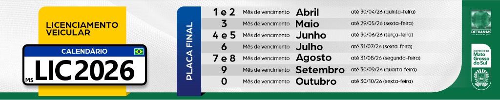 O Detran-MS alerta ainda para processo de inscrição dos débitos de licenciamento na Dívida Ativa do Estado, previsto nas Portarias nº 155 e nº 192. Conforme a legislação estadual apenas o exercício atual (2026) e o anterior (2025), podem ser regularizados diretamente com o Detran-MS, seja pelos canais digitais ou nas agências.